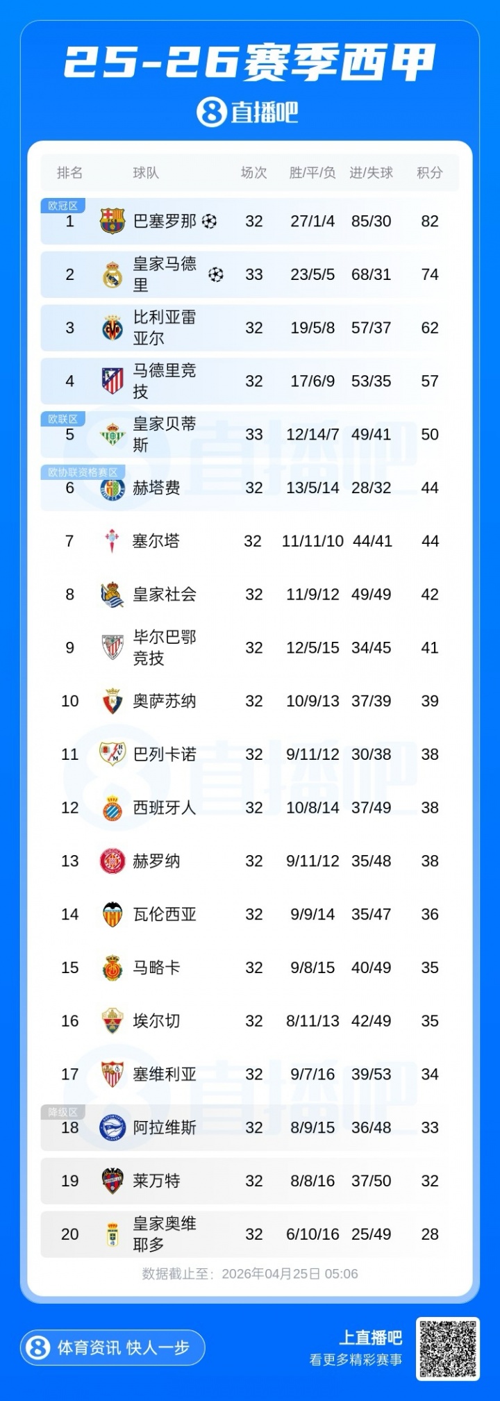 西甲同分对比原则:相互战绩→相互净胜球→联赛净胜球→联赛进球